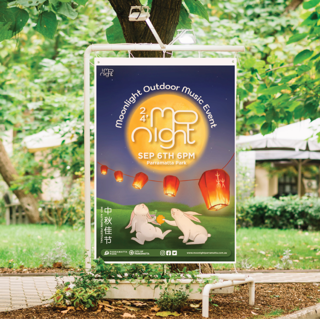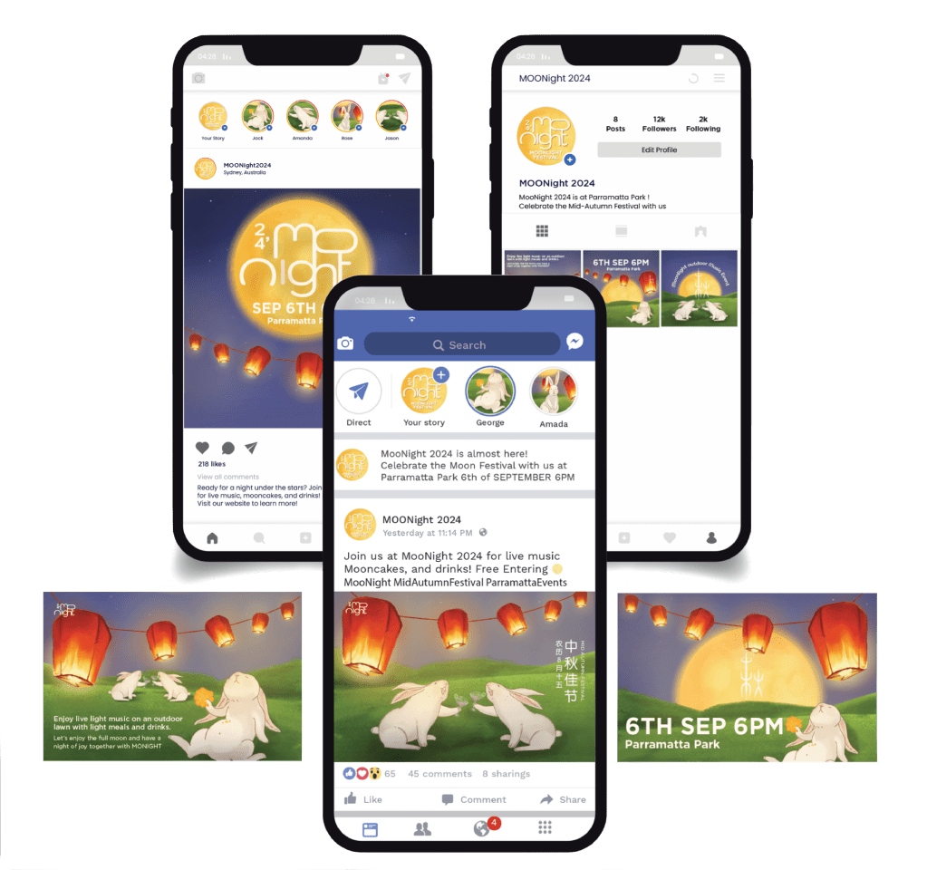 A conceptual branding project for MooNight, a modern outdoor music event reimagining the Mid-Autumn Festival for a young adult audience. The promotional suite, including posters and social media graphics, captures the event’s core vibe: a relaxed, moonlit evening of music, lanterns, and social connection.